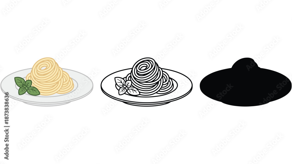 An illustration of three plates of pasta in different styles and colors #1873838636