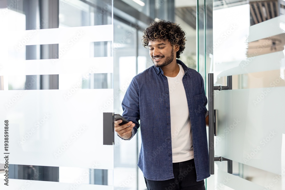 An Indian smiling man holds a phone in his hands, opens the door and enters the office premises #1938591868