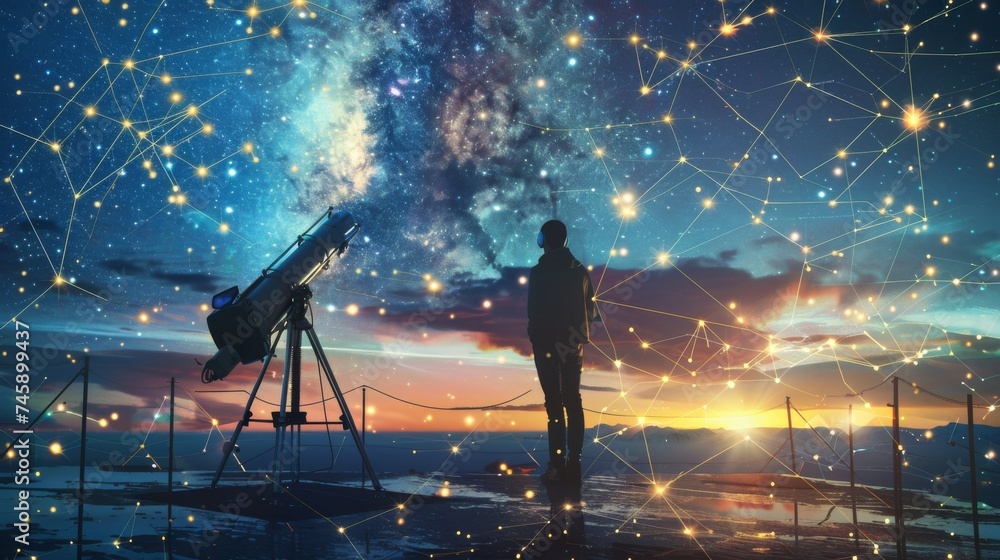 An individual stands before a starlit sky, connected to a complex cosmic network, symbolizing the quest for astronomical knowledge and discovery. #745899437
