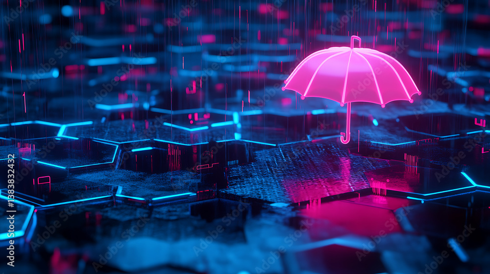 An insurance plan with hexagons and an umbrella icon at the top, an artificial assistant, an insurance system, an artificial agent, a digital technology, an ai integration, and futuristic services #1383832432