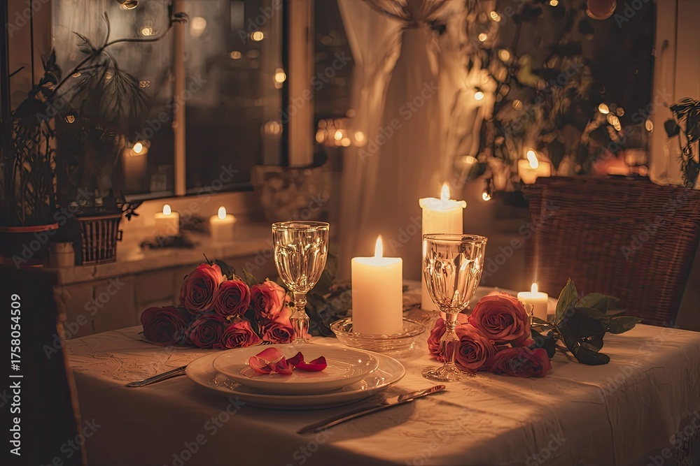 an intimate setting of a candlelit dinner table with two red roses in a vase at the center. a wine glass and plate are also present on the table #1758054509