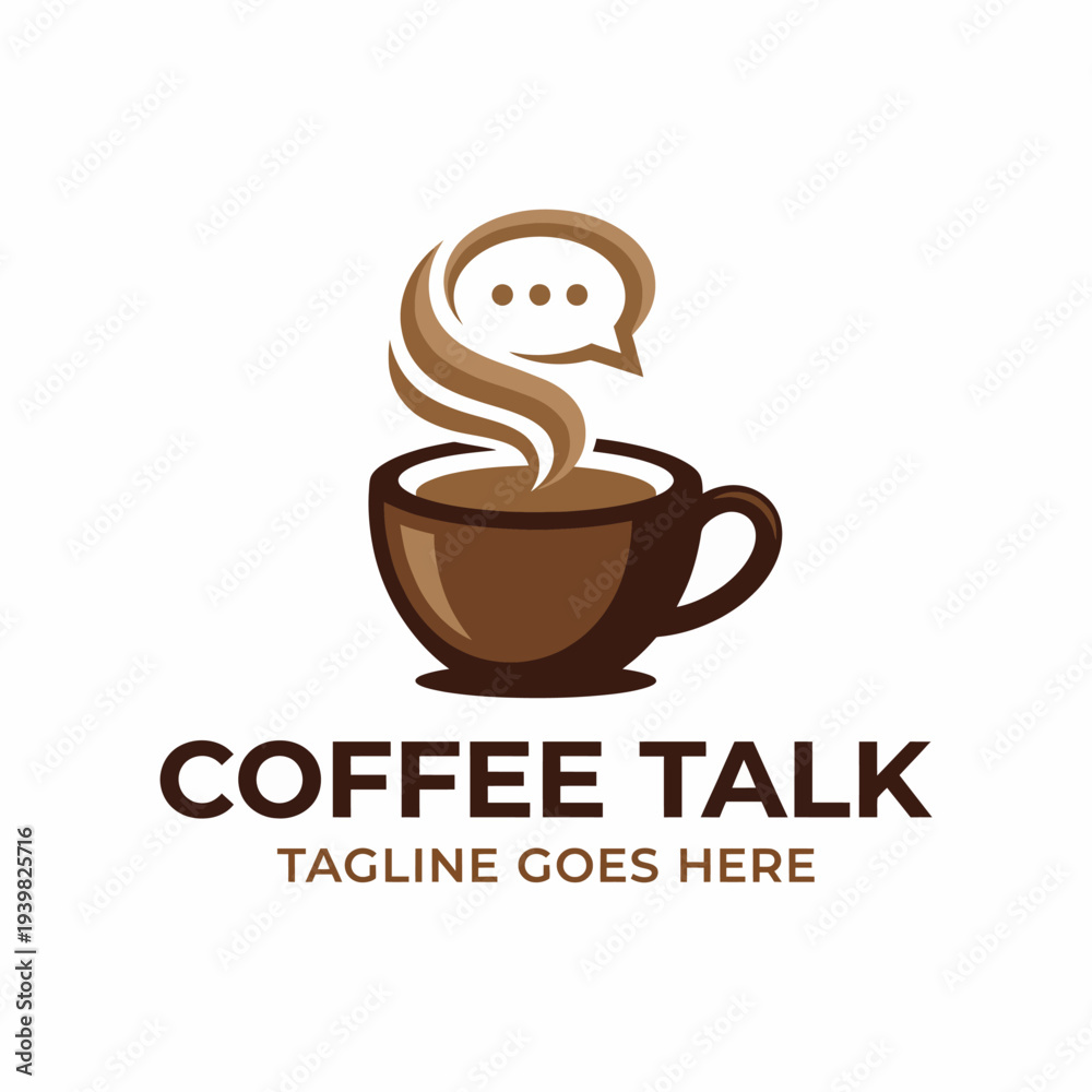 An inviting coffee cup logo design featuring steam and chat bubbles, representing a cozy atmosphere for conversation and connection over coffee breaks. #1939825716