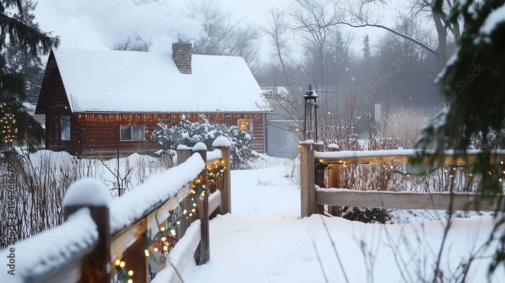 An inviting log cabin surrounded by a pristine snowy landscape, adorned with festive lights, capturing the essence of a winter retreat #1962805755