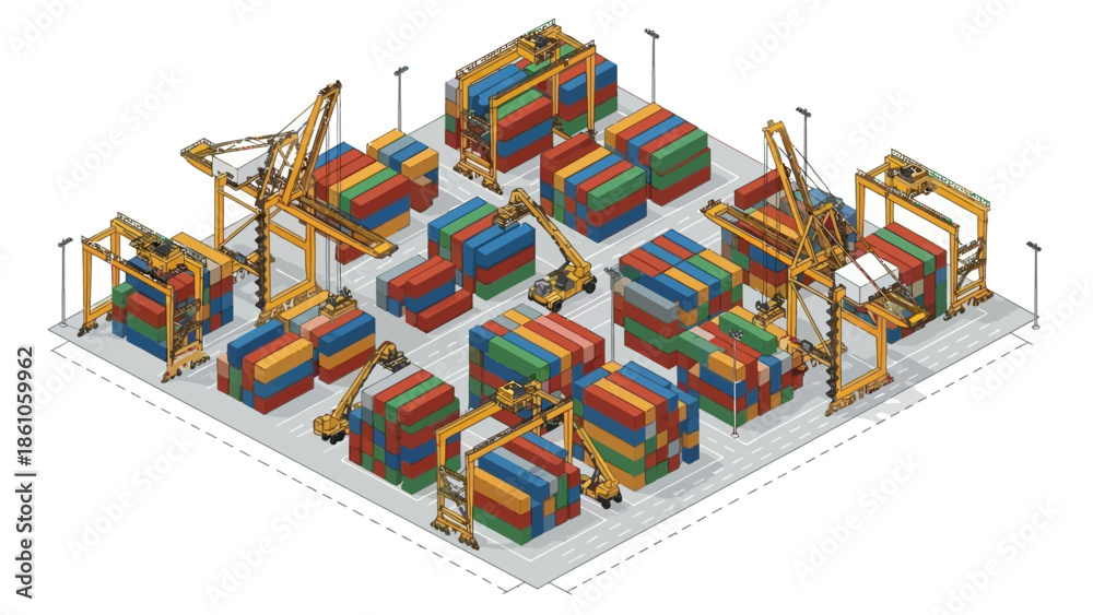 An isometric illustration of a busy container terminal with cranes and stacks of shipping containers. #1861059962