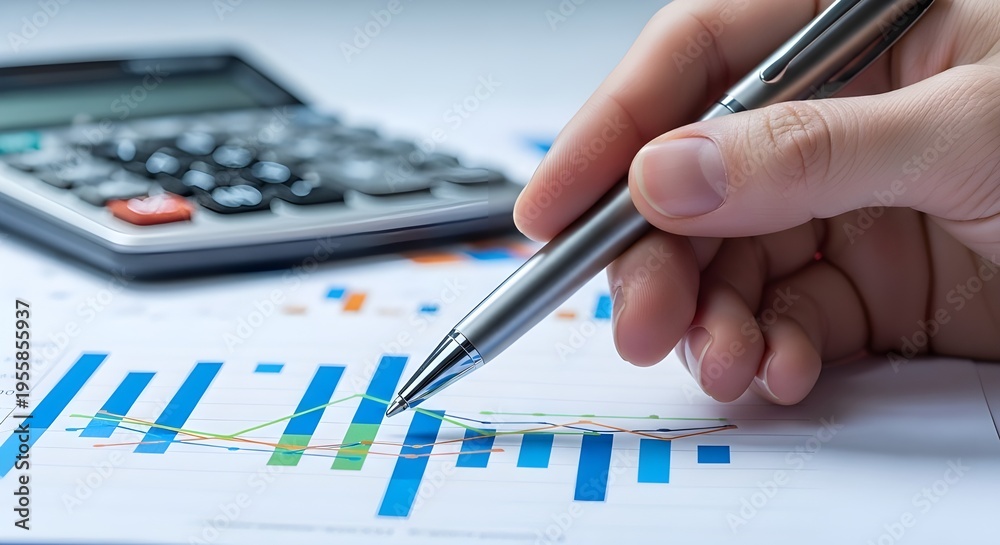 Análisis manual de gráficos de negocios con un bolígrafo en informes impresos, que simboliza la toma de decisiones de análisis financiero y el concepto de estrategia basada en evidencia y gestión del #1955855937