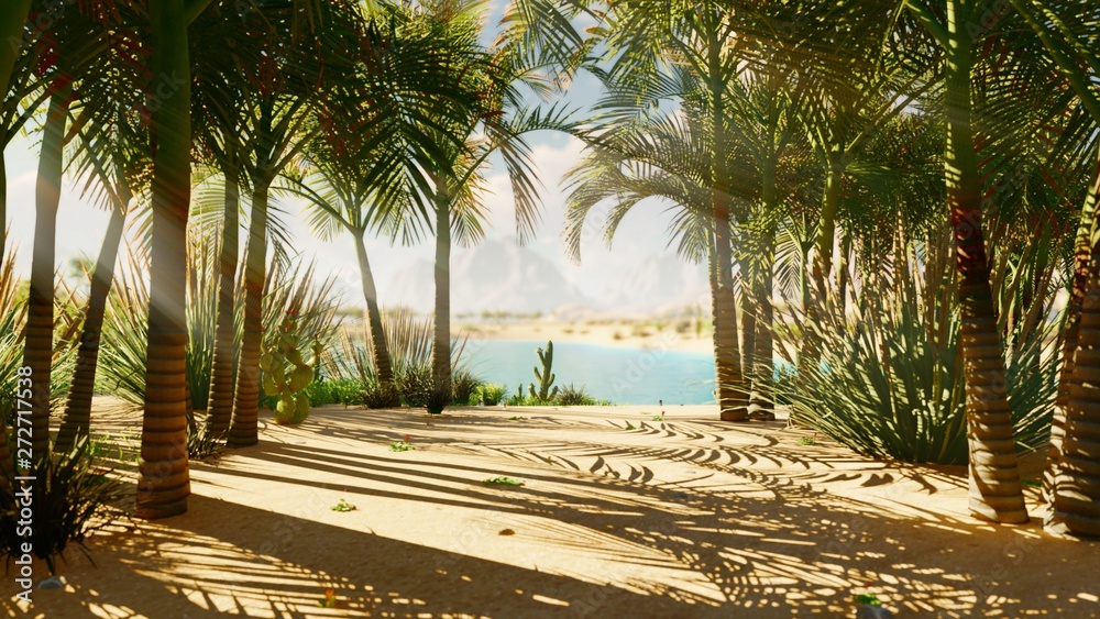 An oasis in the desert. Clear hot day. Distant mountains, sand dunes and a sultry sky. Beautiful scenery. Insects in the bushes and birds in the sky. Sand dunes and cacti. 3D Rendering #272717538