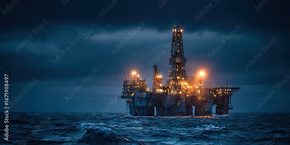 An offshore oil rig at night, illuminated against a stormy sea #1671908497
