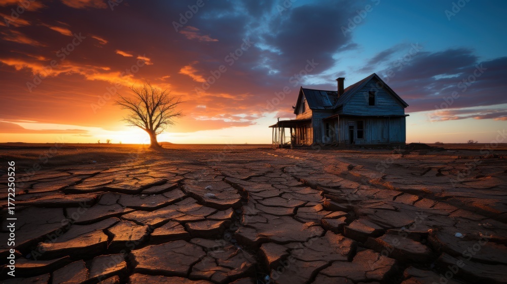 An old, dilapidated house stands alone in a parched landscape, cracked earth stretching far and wide as a colorful sunset casts warm hues across the sky. #1772250526