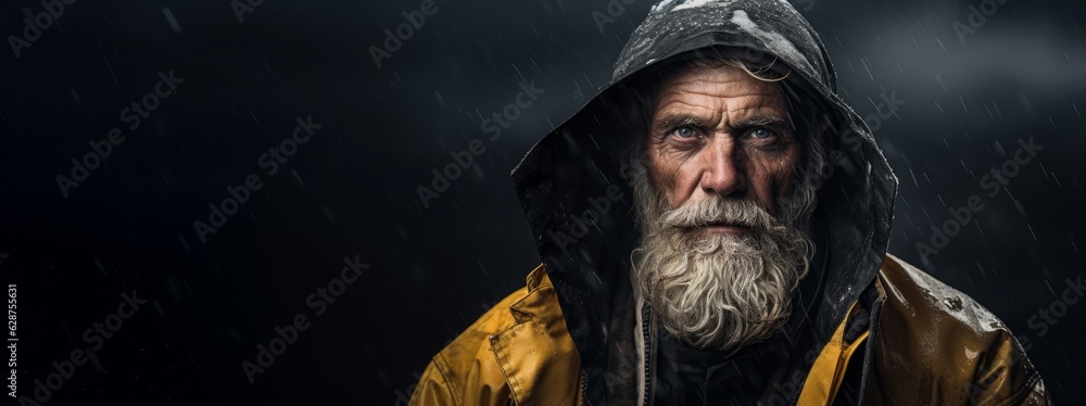 An old fisherman in a raincoat stands during a thunderstorm with copy space. Generative AI #628755631