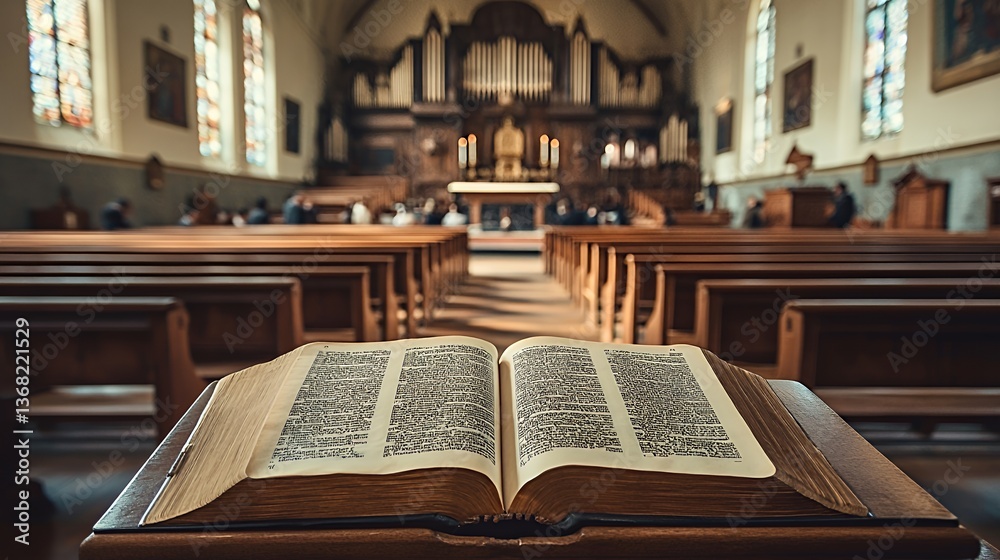An open Bible on a wooden lectern in a historic church setting. #1368221529