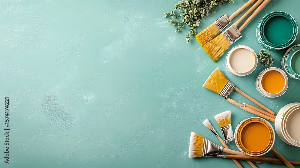 An organized arrangement of colorful paint buckets and brushes with ample copy space for additional text or design elements #1574174221