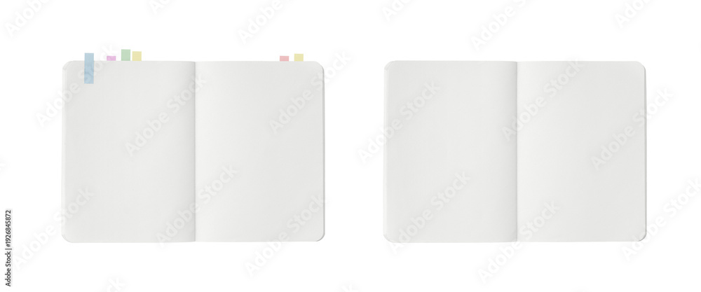 An overhead view shows a white, rounded notebook open to two spreads: one with color-coded sticky notes, the other without #1926845872