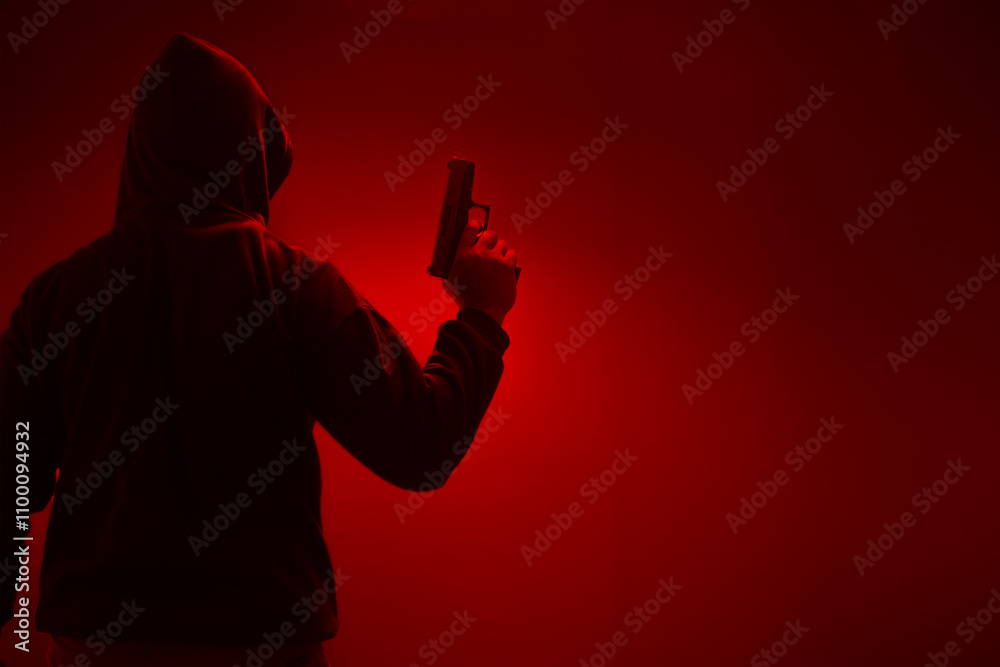 An unidentified man in a black hood and black mask stands holding a gun in various poses. Light is shining from above. Looks scary. Isolated over film studio background. Armed person. #1100094932