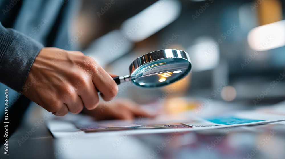 An unrecognizable printing house worker uses a magnifying glass to inspect a printed poster for flaws the lens magnifying colors and details light reflecting off the paper #1704258646