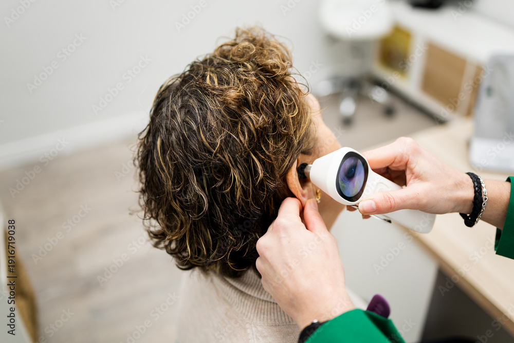 An unrecognizable 60-year-old woman undergoes hearing tests at a medical center. The woman is having her ears examined with a video otoscope. Concept of an otolaryngologist #1916719038
