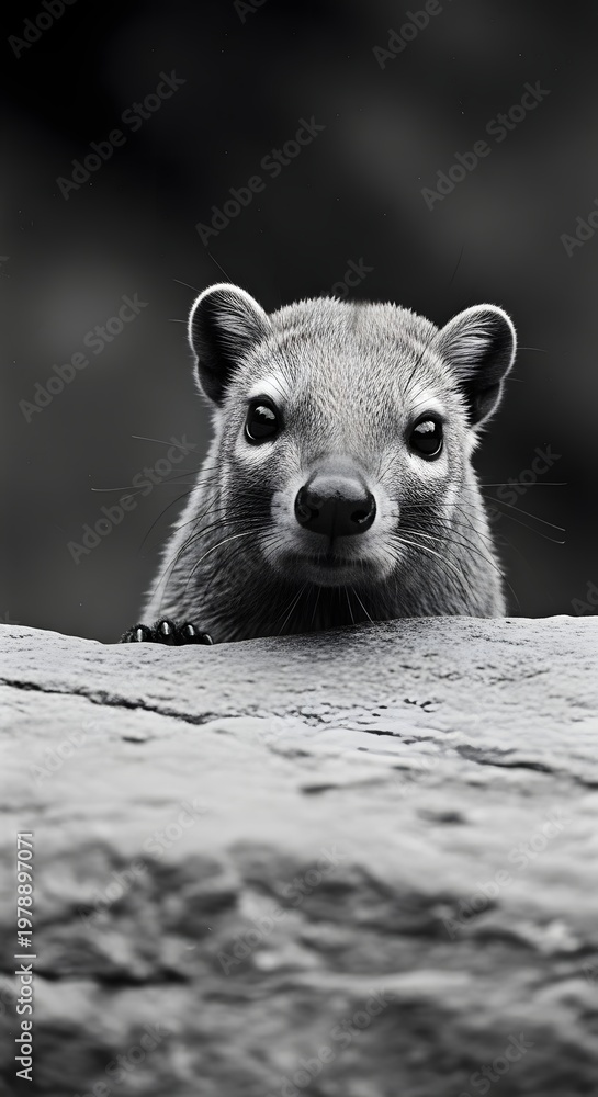 An up-close and personal, high-contrast black-and-white portrait of a captivating rock hyrax peering over a stone, revealing its endearing and inquisitive nature. #1978897071