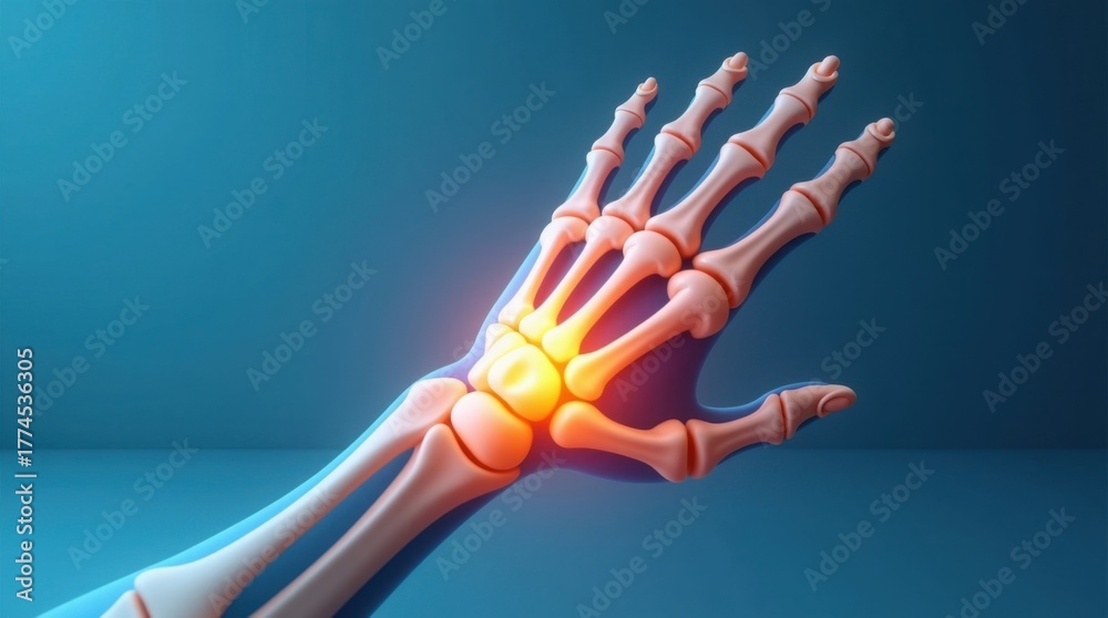 Anatomía de los huesos de la mano humana, mostrando tendones y articulaciones; la zona de dolor se ilumina en naranja. Ilustración médica ortopédica 3D #1774536305