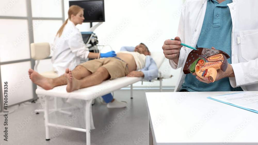 Anatomical model of liver and gallbladder on background of process of ultrasound examination of liver and gallbladder of adult man with ultrasound doctor #1760678336