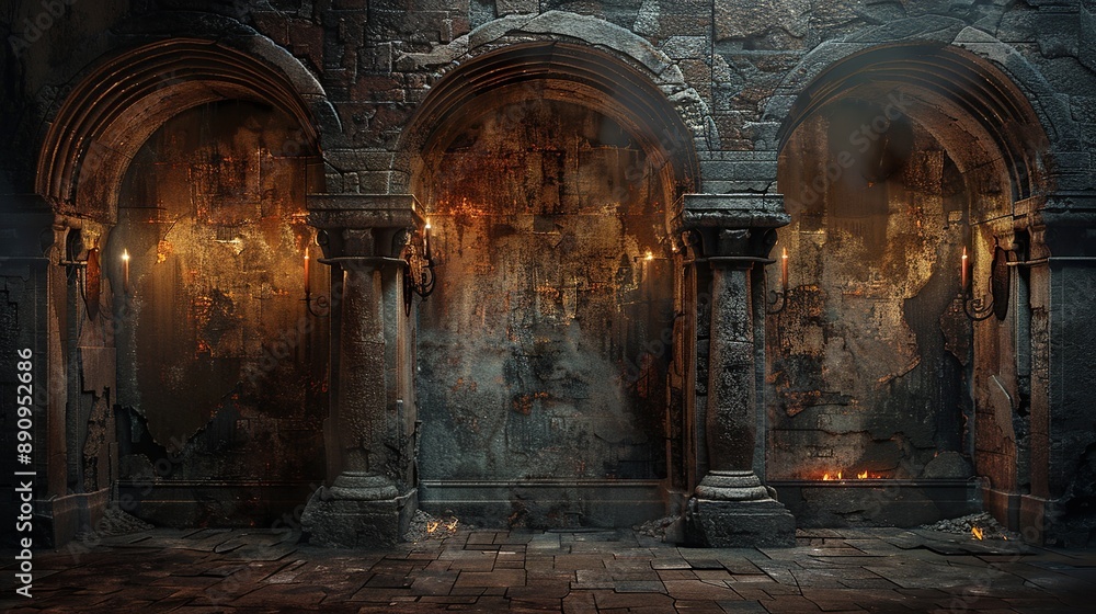 Ancient classic architecture with arches, wall from stone bricks and burning torches #890952686