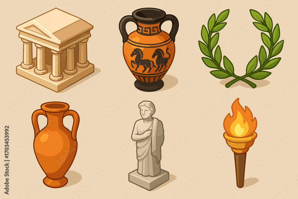 Ancient greek symbols: amphorae laurel wreath torch temple statue #1703453992