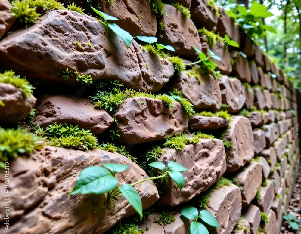 Ancient Mosscovered Stone Wall with Ferns Natural Light #1972013210