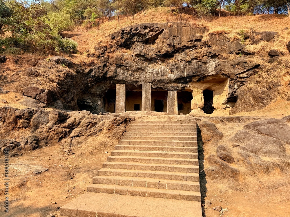 Ancient rock cut cave temple and monumental Shiva sculpture inside Elephanta Caves on Elephanta Island near Mumbai India #1885181182
