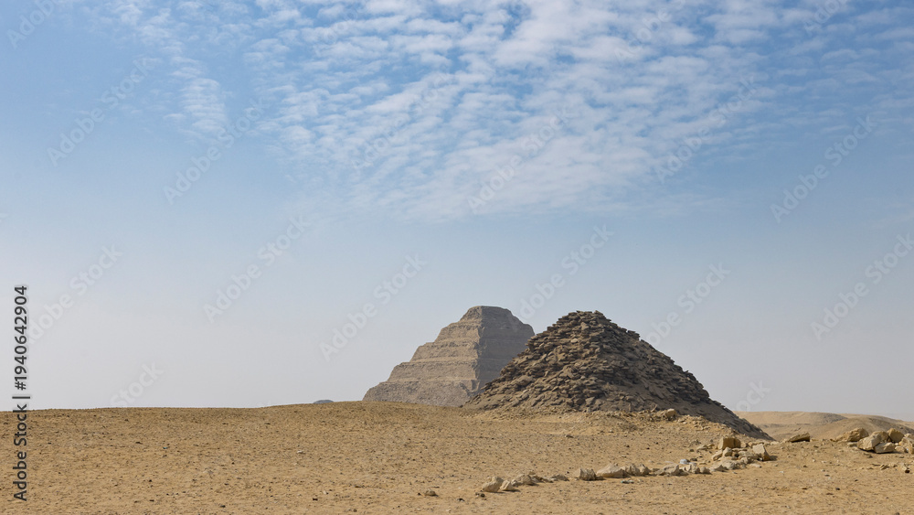 Ancient step pyramid and stone cairn in Cairo, Egypt desert landscape under blue sky #1940642904