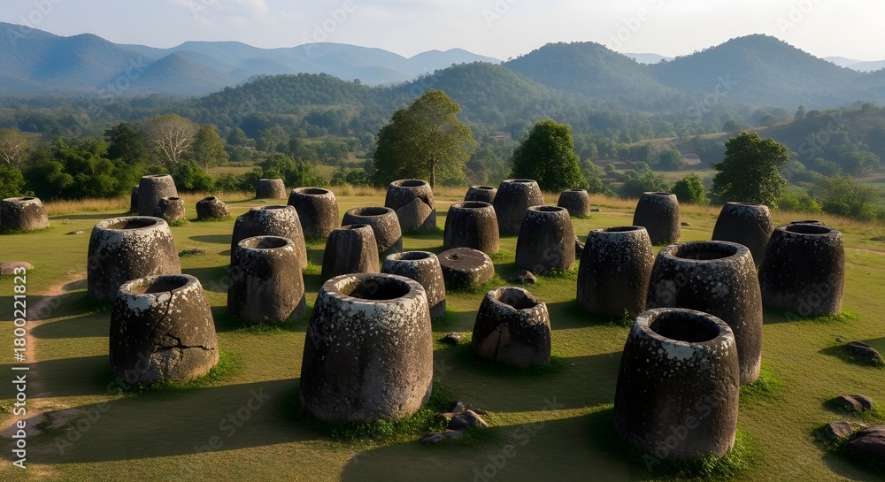 Ancient Stone Jars in Landscape: A cluster of imposing stone jars, remnants of a bygone era, dot a verdant landscape under a serene sky. These weathered monoliths stand as silent witnesses. #1800221823