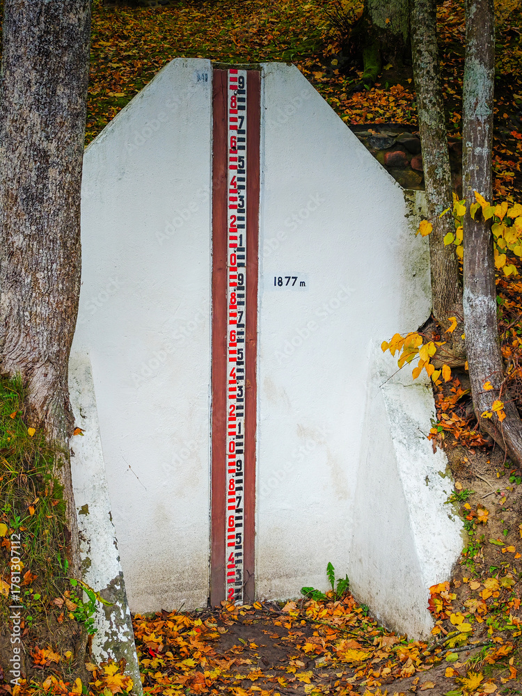 Ancient stone with a meter river level measuring station standing in a meadow away from the river #1781307112