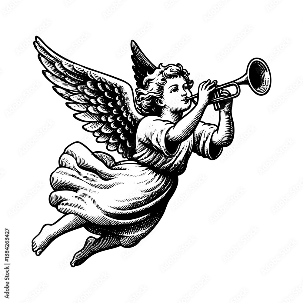 Angel flying playing trumpet sketch engraving black and white outline. Scratch board imitation. illustrated in vintage line art style on a white background. #1384263427