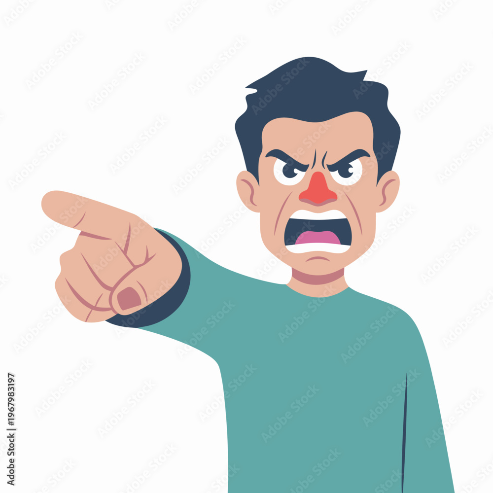 Angry man pointing forward with aggressive facial expression showing rage and frustration, stylized vector illustration representing conflict, bullying, demanding customer service, blame or yelling au #1967983197