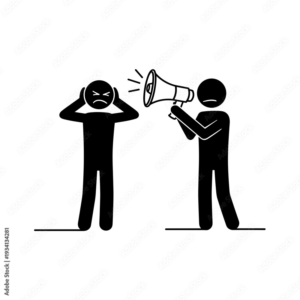 Angry person covering ears while another yells through a megaphone for advertising and social awareness campaigns #1934134281