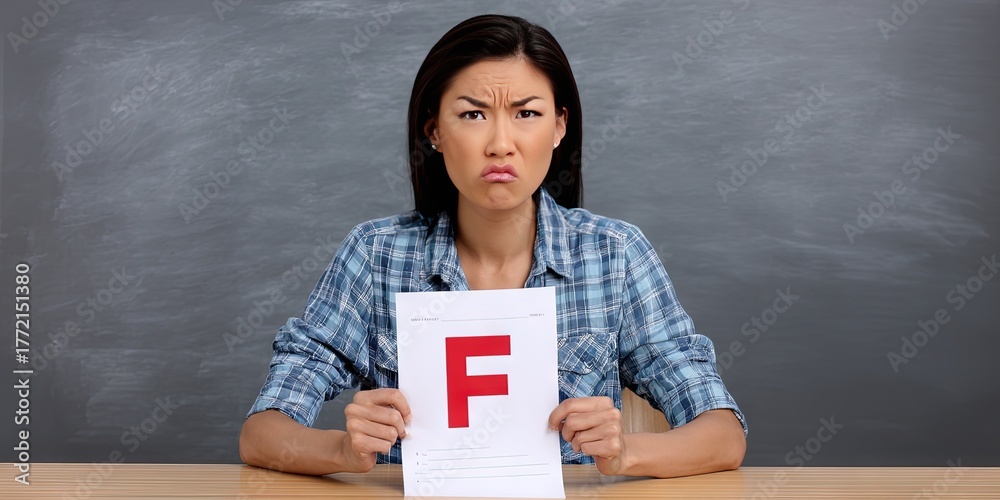 angry teacher sitting at desk holding exam with red "F" #1772151380