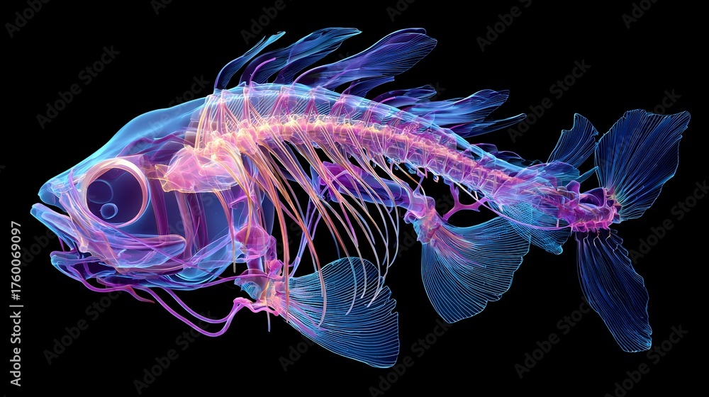 Animal aquatic adaptation glowing neon fish skeleton radiant gills futuristic scientific conceptual illustration #1760069097