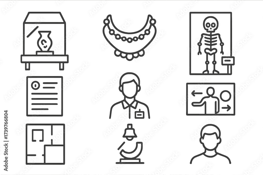 Anthropology Museum Icons. Line style icons of anthropology museum elements: exhibit case, ancient necklace, skeleton display, #1739766804