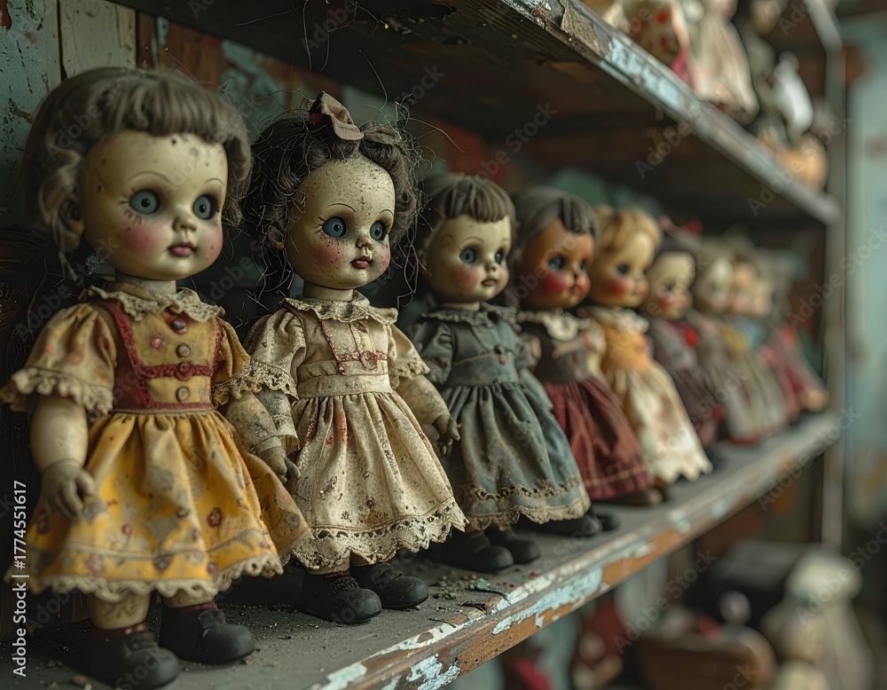 Antique Dolls Displayed on Wooden Shelves in Rustic Setting #1774551617