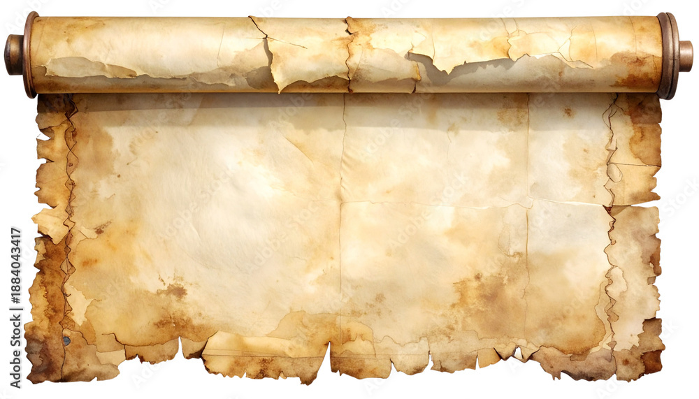 Antique textured parchment scroll and aged blank manuscript pages with a grungy sepia texture set on vintage wood and bamboo material for a brown retro design #1884043417