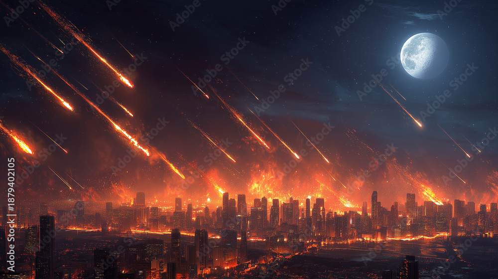 Apocalyptic city under meteor shower with fiery explosions and missile strikes, capturing chaos, destruction, and a dramatic end-of-world atmosphere. #1879402105