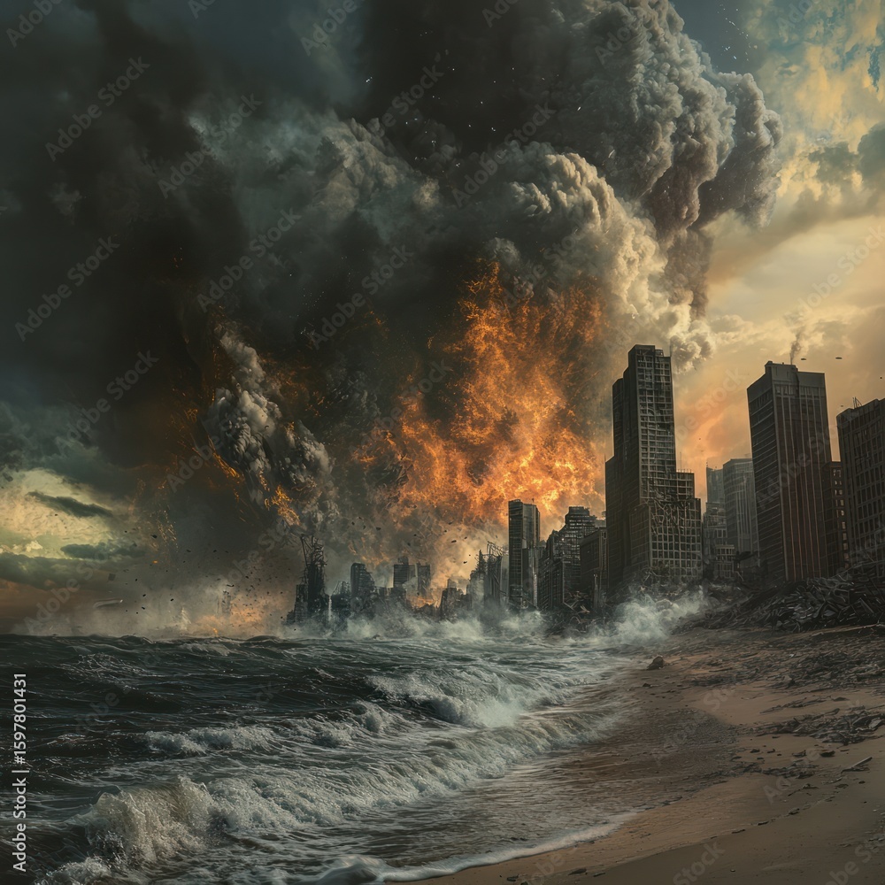 Apocalyptic cityscape ravaged by fire and waves #1597801431