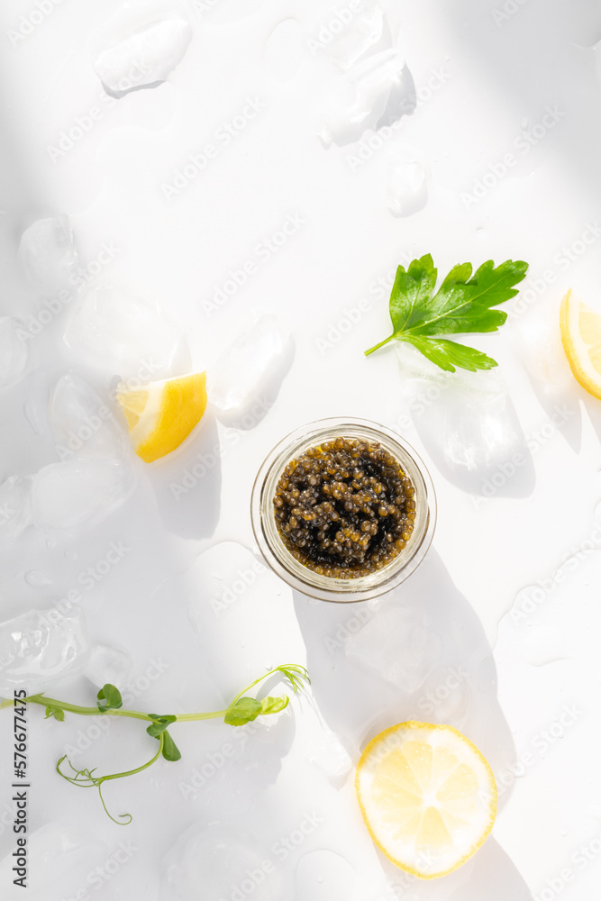Appetizers of natural sturgeon black caviar, lemon and parsley #576677475