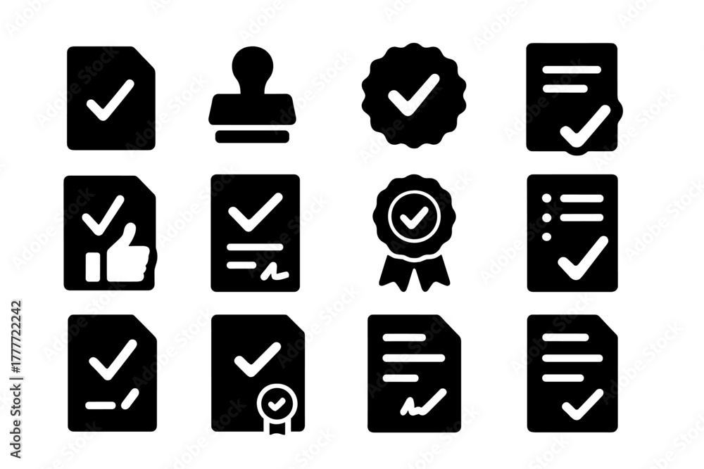 Approval Icons Collection. Solid style icons of Approval marks: checkmark on paper, approved stamp, seal of approval, validated #1777722242