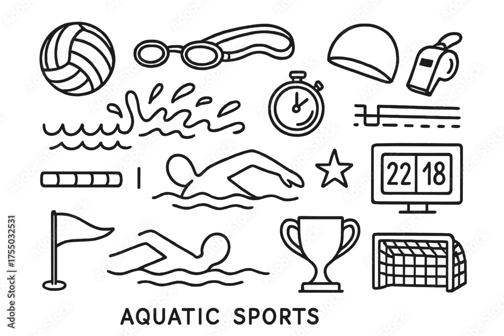 Aquatic Sports Doodle. Aquatic sports. Hand-drawn doodle illustration aquatic sports ball, goggles, swim cap, splash, wave, stopwatch, whistle, pool lane, #1755032531
