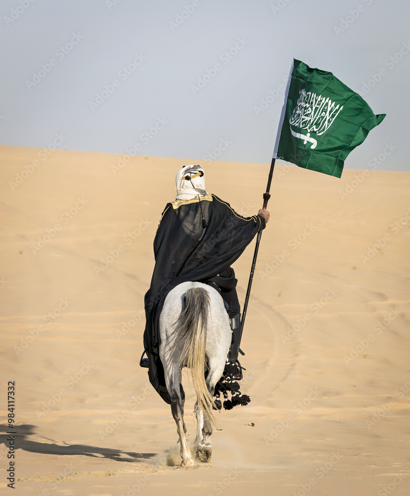 Arabian Warrior, riding his white stallion with Saudi Arabian flag in the empt quarter desert #984117332