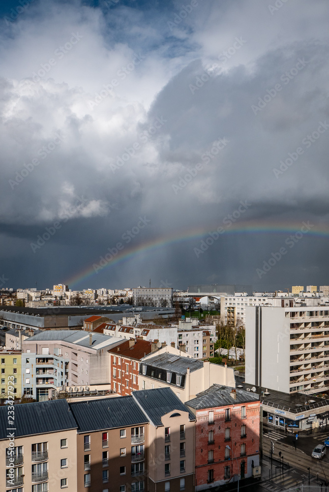 Arc en ciel, après l'orage, au dessus de Saint-Denis 93, banlieue parisienne, rue Gabriel Péri vertical #233427923