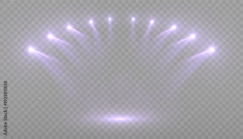 Arc stage spotlights with soft purple beams and haze for theater scenes, concert shows, events and presentation backdrops. #1925811555