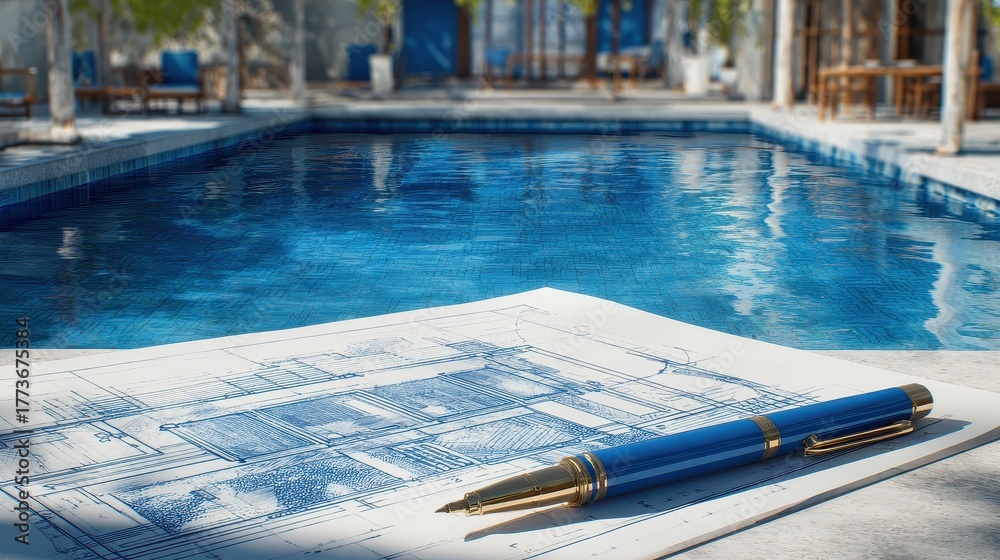 Architectural blueprints beside a serene pool on a sunny day showcasing design creativity and relaxation #1773675384