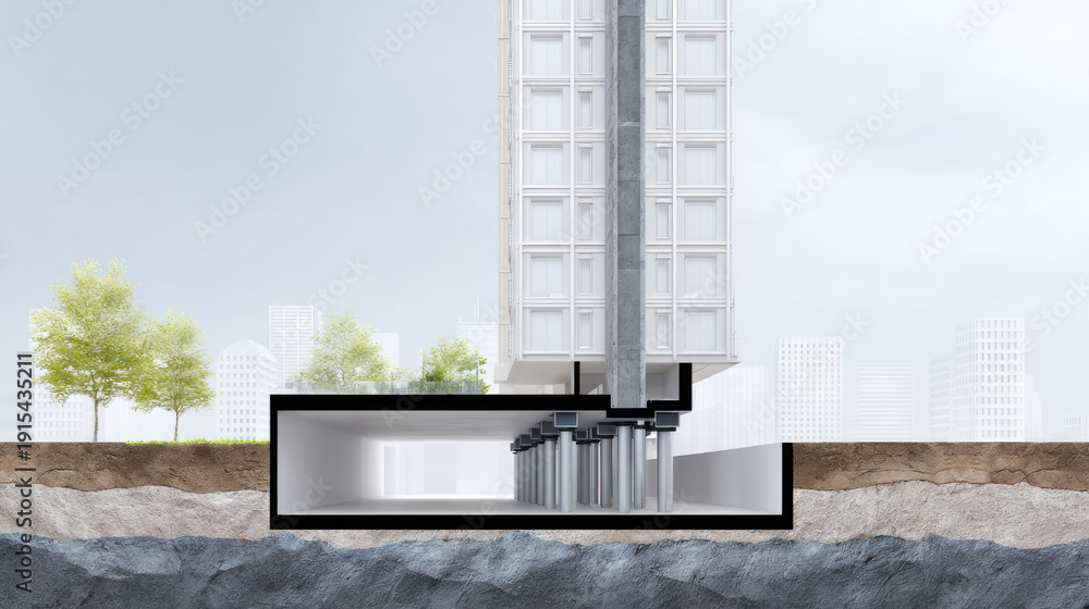 Architectural cross section model revealing underground foundation and building structure with soil layers and urban background #1915435211