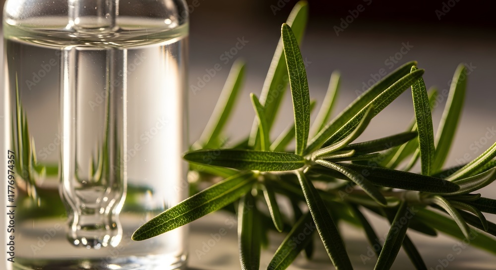 Aromatherapy Rosemary Essential Oil Dropper Bottle with Fresh Herb Sprig Macro Closeup #1776974357