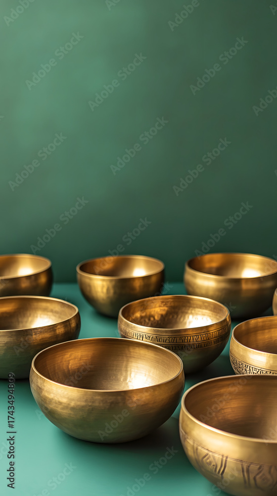 Array of Tibetan singing bowls meticulously arranged in a serene meditation room vertical - green background #1743494809