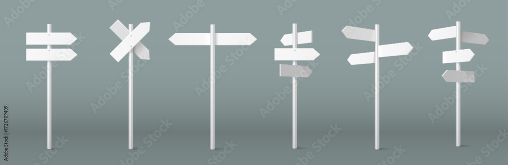 Arrow sign on pole set with white directional markers on posts for wayfinding and navigation systems. Crossroad signposts with multiple pointing boards for outdoor guidance. Street direction indicator #1726709409
